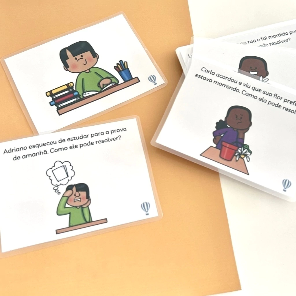 14 cards com figuras que mostram a solução do problema